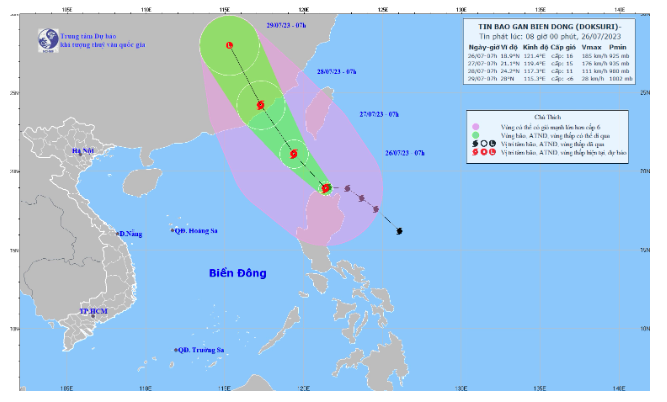 Theo Trung tâm Dự báo Khí tượng Thủy văn Quốc gia, hồi 7h ngày 26/7, vị trí tâm bão Doksuri ở vào khoảng 18,9 độ Vĩ Bắc; 121,4 độ Kinh Đông, trên vùng biển phía Bắc đảo Luzon (Philippines). Sức gió mạnh nhất vùng gần tâm bão mạnh cấp 15-16 (167-201km/giờ), giật trên cấp 17.