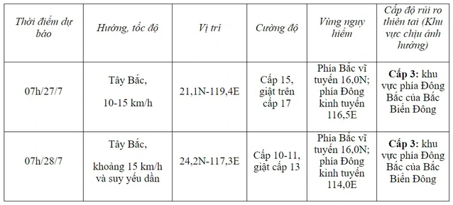 Trên biển: Vùng biển phía Đông Bắc của khu vực Bắc Biển Đông có mưa bão, gió mạnh cấp 6-7, từ chiều và đêm ngày 26/7 mạnh lên cấp 10-12, vùng gần tâm bão mạnh cấp 13-15, giật trên cấp 17; biển động dữ dội, sóng biển cao 5,0-7,0m.