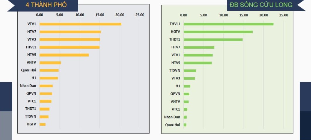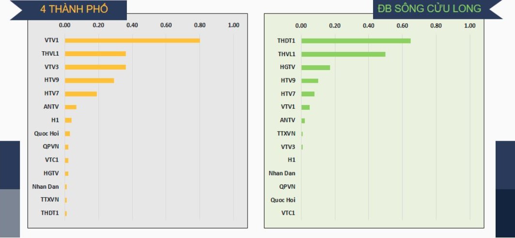 Thứ hạng xếp hạng theo tỷ lệ khán giả không trùng lặp trung bình mỗi ngày của từng kênh trong khung giờ 6h-22h tuần này tại khu vực 4 thành phố lớn không có nhiều sự thay đổi. Đối với khu vực ĐBSCL thì top 10 đánh dấu sự vượt lên của kênh HGTV, kênh THDT1 đã bị đẩy xuống vị trí số 3.