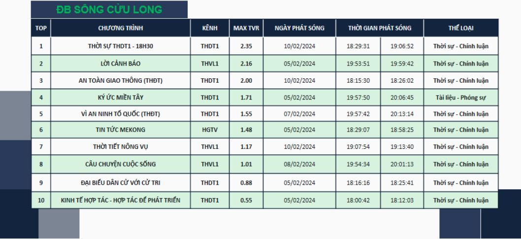 Đối với khu vực DBSCL, chương trình “Thời sự THDT1 – 18h30” và “Lời cảnh báo” vẫn giữ vững top 1,2 trong top 10 MAX TVR chương trình thời sự chính luận.