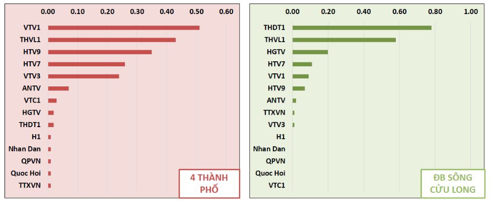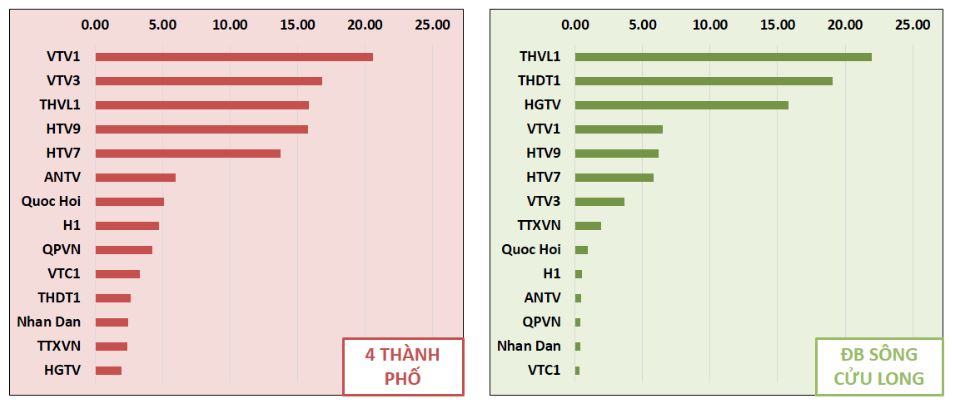 Đối với khu vực DBSCL, chương trình “Thời sự THDT1 – 18h30” vẫn duy trì top 1 trong nhiều tuần. Chương trình “Tin tức Mekong” của kênh HGTV cũng đã vượt lên vị trí số 2.