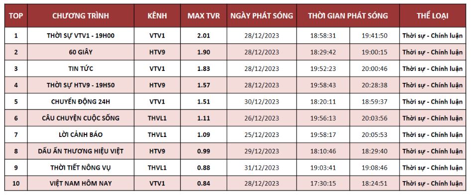 Chương trình “Thời sự VTV1 – 19h00” vẫn giữ vững phong độ đứng đầu TOP 10 MAX TVR tuần 25/12 – 31/12/2023. Tuy nhiên so với tuần trước hầu hết các chương trình đều giảm chỉ số MAX TVR. Khung giờ vàng vẫn đang là khung giờ chiều tối từ 17:30 – 20:00.