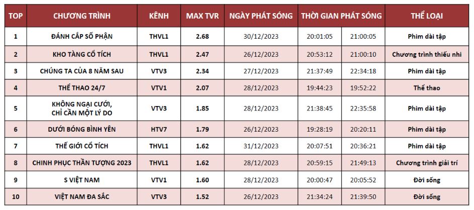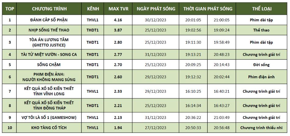 Tiếp tục chia nhau các vị trí trong TOP 10 chương trình giải trí và phim tuần 25/12 – 31/12/2023 đó là THVL1 và THDT1. Bộ phim ăn khách “Đánh cắp số phận” của THVL1 đạt MAX TVR 4.16 chiếm ngôi đầu bảng.