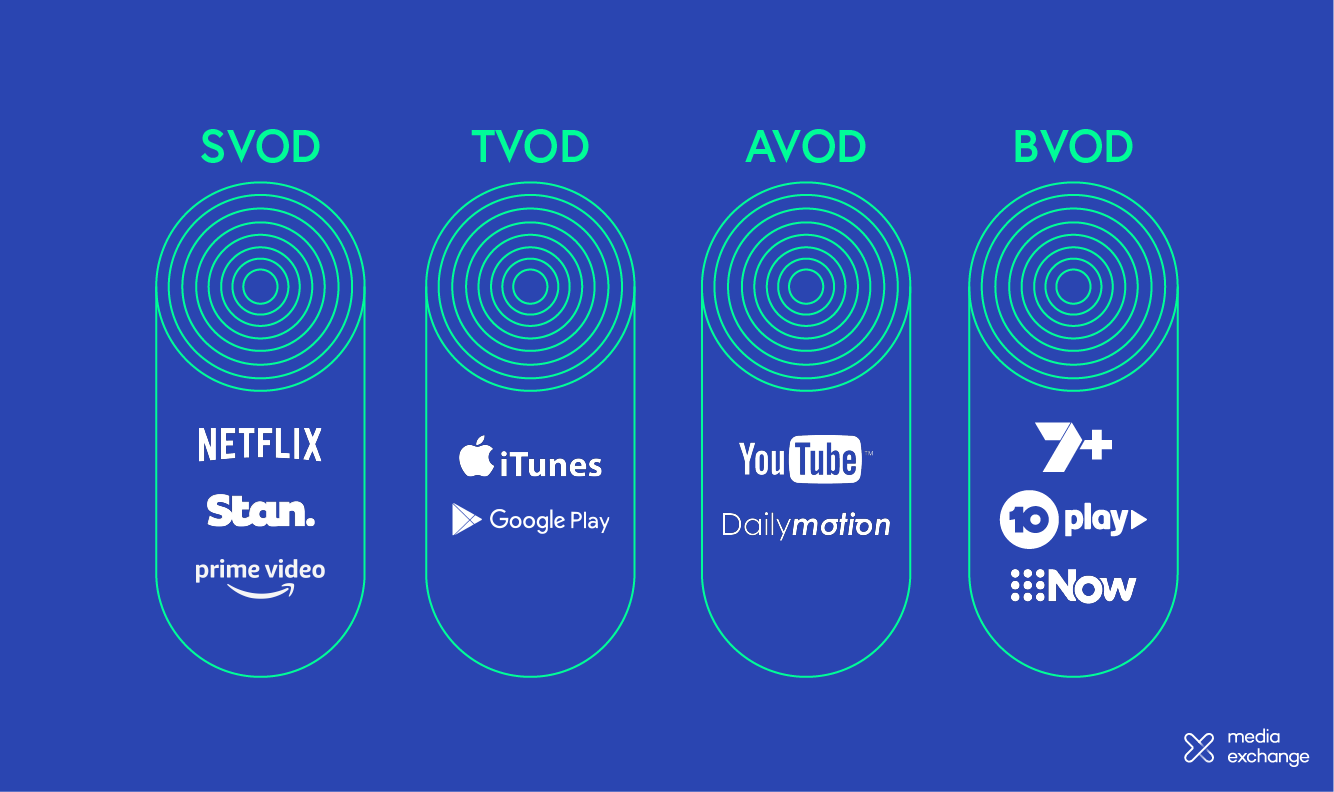 AVOD (Advertising video on demand): Loại hình này tương tự như BVOD bởi việc xem miễn phí và có quảng cáo. Tuy nhiên, định nghĩa của AVOD rộng hơn và bao gồm các trang web chuyên về video như YouTube, nội dung đa dạng khác nhau và chất lượng của nội dung cũng có thể rất khác nhau.